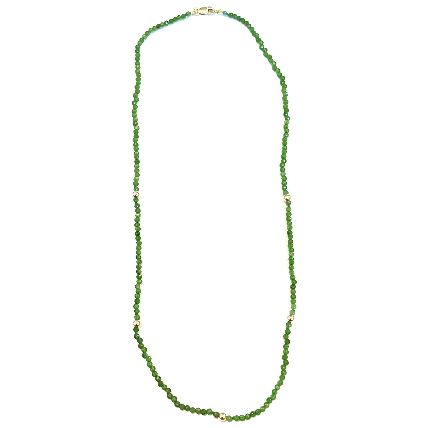 A natural Emerald gemstone necklace complemented by 18K gold bead accents for a touch of luxury and pop of color.