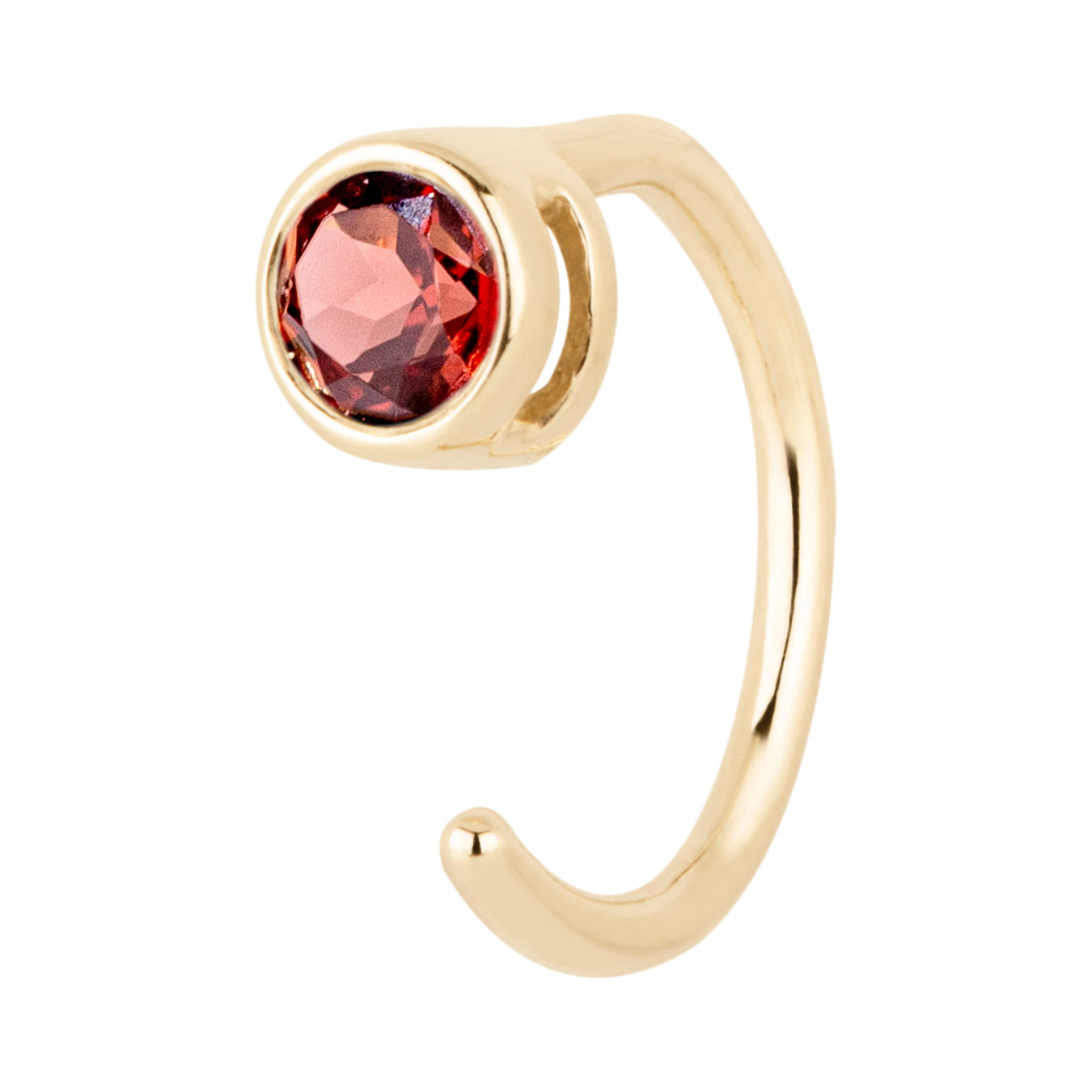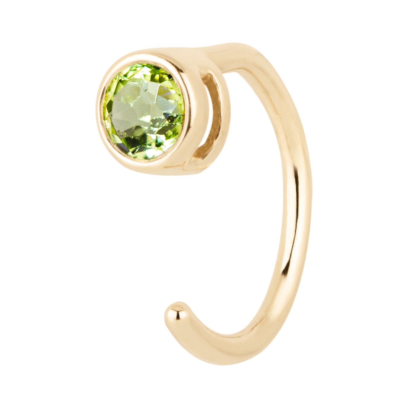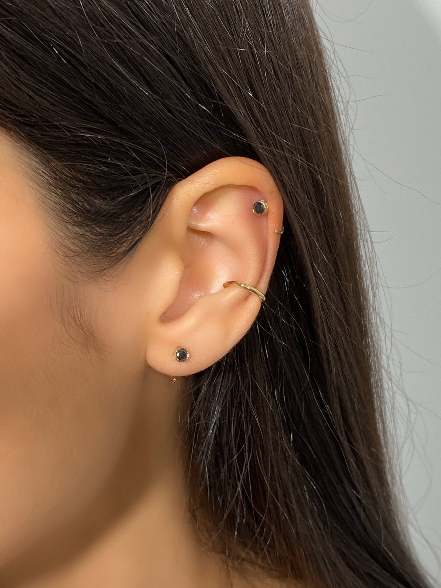 A shimmering gemstone sits on top of an open huggie hoop earring. You'll find yourself wearing this earring all day, every day! Sold as a single earring. Shown in 14K turquoise, 14K black diamond, and 14K opal paired with our classic ear cuff. All birthstone colors are available!