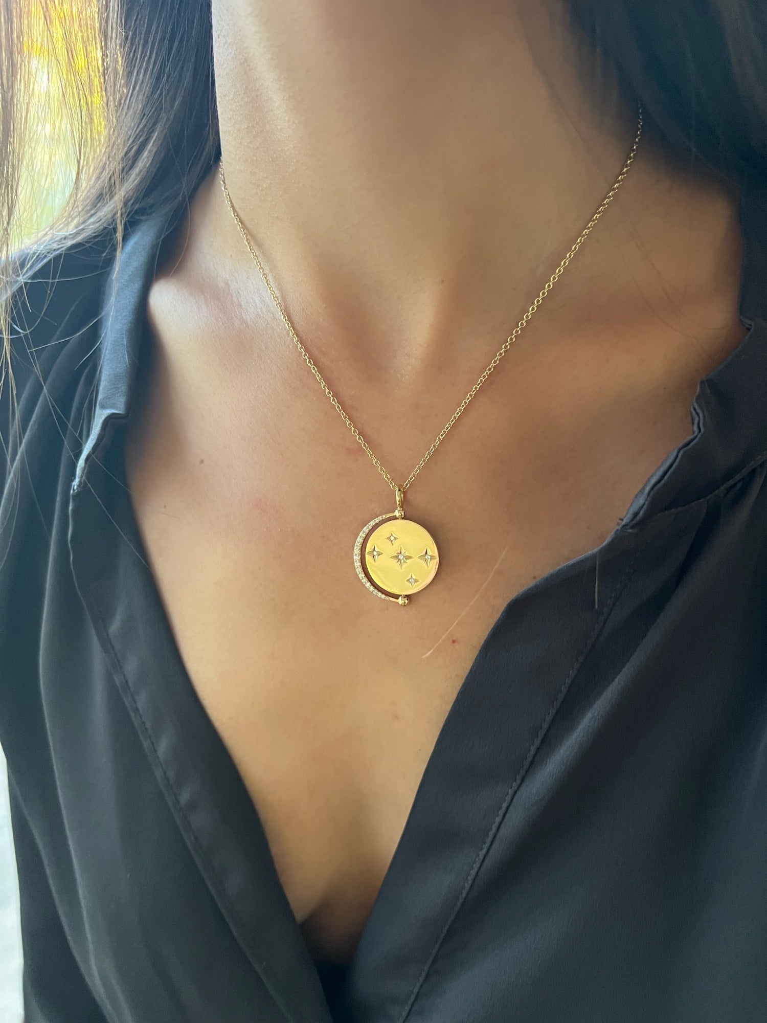 Style this rotating necklace multiple ways! The center disc rotates to show a diamond moon and star combination or a diamond moon and sun with a satin finish.