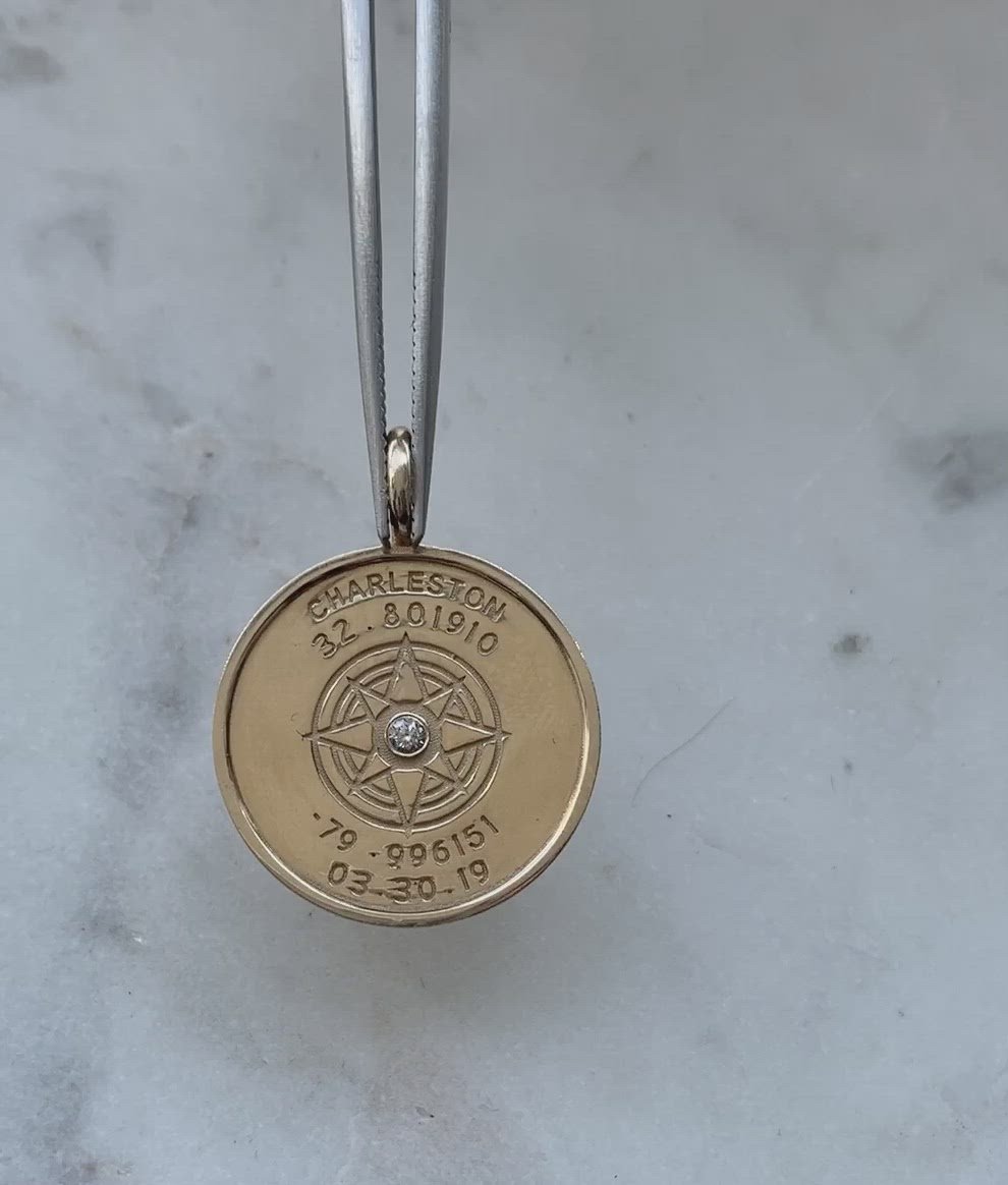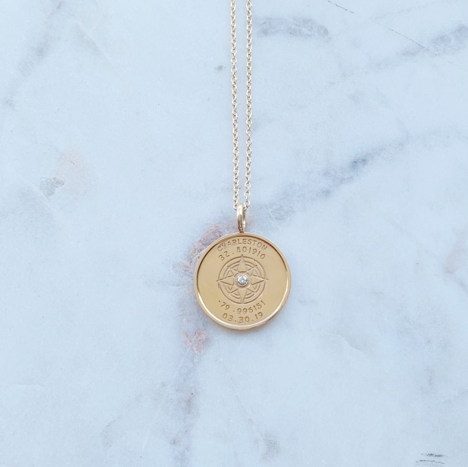 Save the Date! This double-sided pendant features the coordinates and date of a special event on one side and the shimmering stars above your event on the flip side.